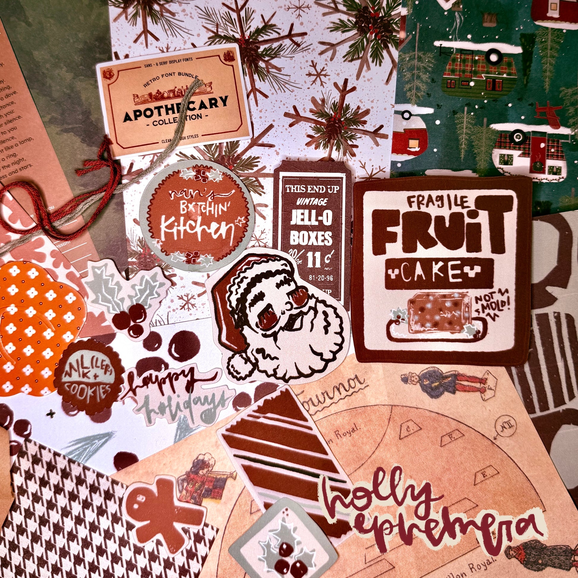 the ephemera has a range of 'junk' that is festive-ish. all packs will have 4 6x6 sized cardstock of our designs, cardstock die cuts of our holly deco, plus 3 random 6x6 sized cardstock and assorted ephemera. not every pack is identical but some have related items.